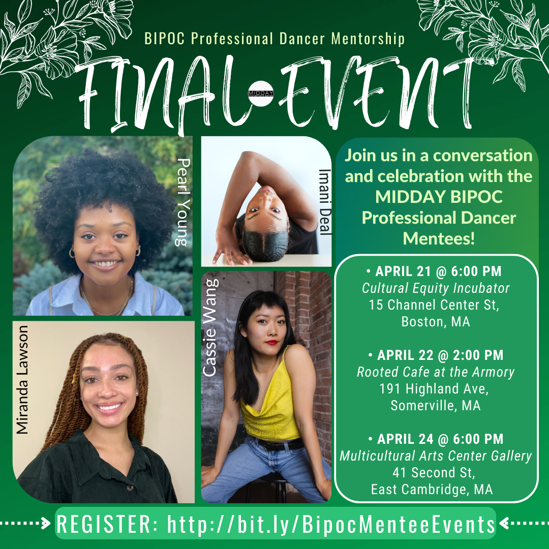 Final Event poster with green background, event information in white on the right side and artists' photos on the left.