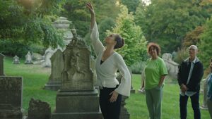 Dancer in white long sleeve top reaches one arm up gently and looks up at fingers, as two people observe in the background of the cemetery.