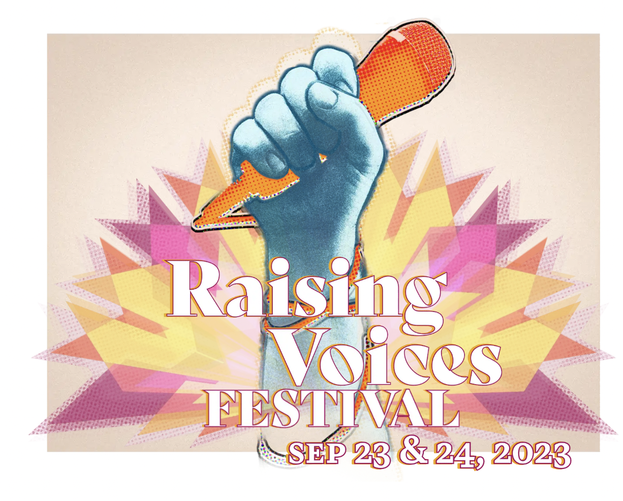 Illustration of hand holding a microphone up with colorful geometric rays in the background.