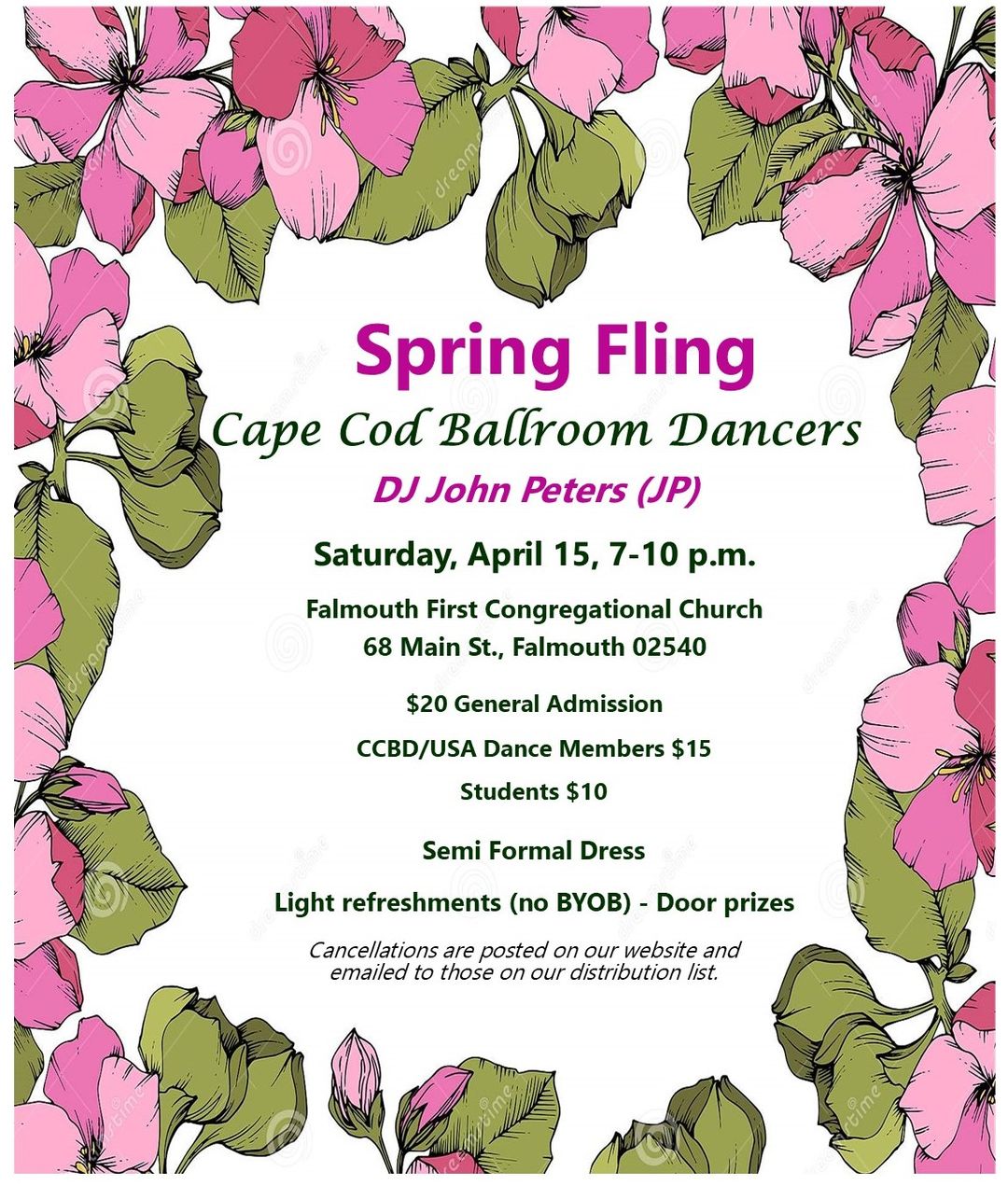 Spring Fling poster with evet information in the center of the poster over a white background and pink flowers frame the information.