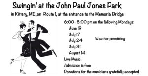 Swing dance poster with information in black font over a plain white background and an illustration of a couple dancing together.