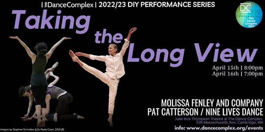 "Taking the Long View" poster with event information on the right side and a collage of two photos (one of each of the choreographers' works): one is a group of dancers kneeling and clumping together while one stands and reaches arms up, while the other photo is a soloist in all white lifting one leg up by their side and opposite arm up, while the other arm reaches in direction of the leg that is lifted.