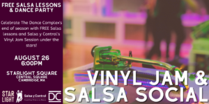 Photo of vinyl reader and event information in a dark purple box to the left.