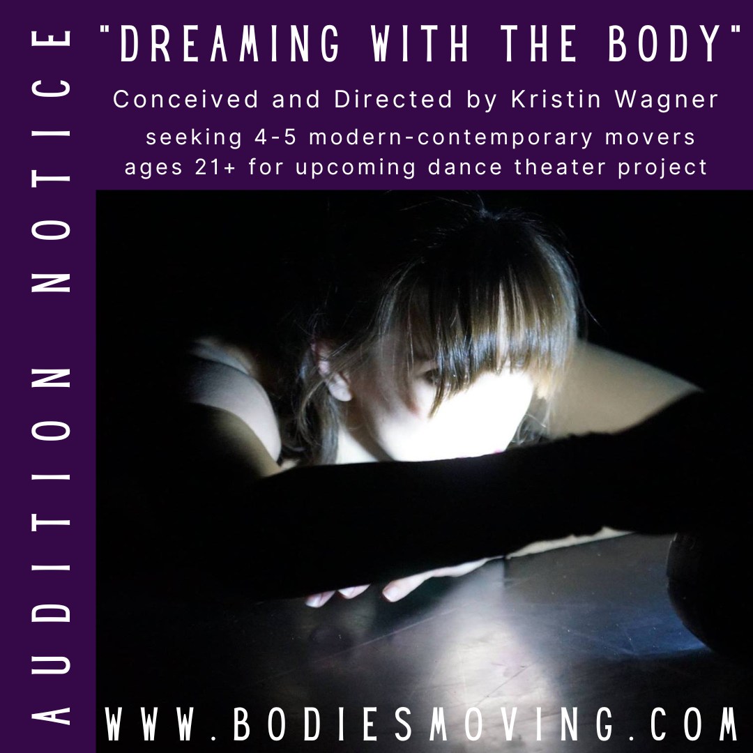 Audition notice for Kristin Wagner's "Dreaming with the Body" with a photo of Kristin on the floor and with bright white light on her face, removing any details from her face other than her bangs.