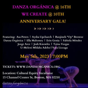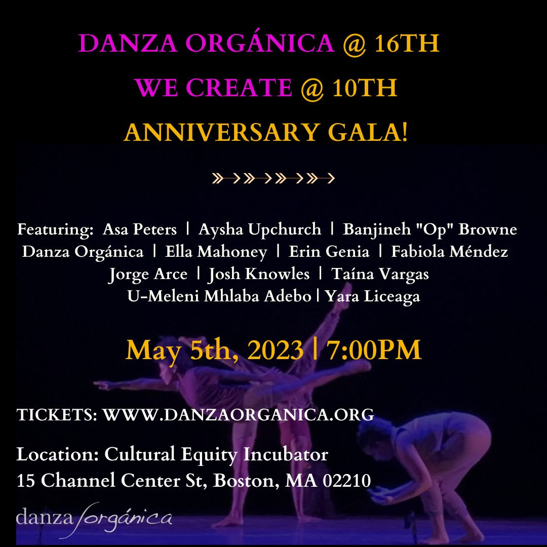 We Create! poster with event information displayed in yellow, white and purple font over a dark image of dancers in purple light.