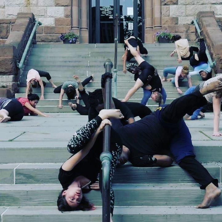 Multiple dancers in various daily attire spread out through a large staircase doing inversions, exploring the floor and railing.