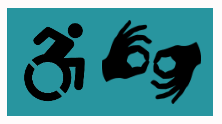Image: Icons of person in a wheelchair and ASL signing hands on turquoise background.