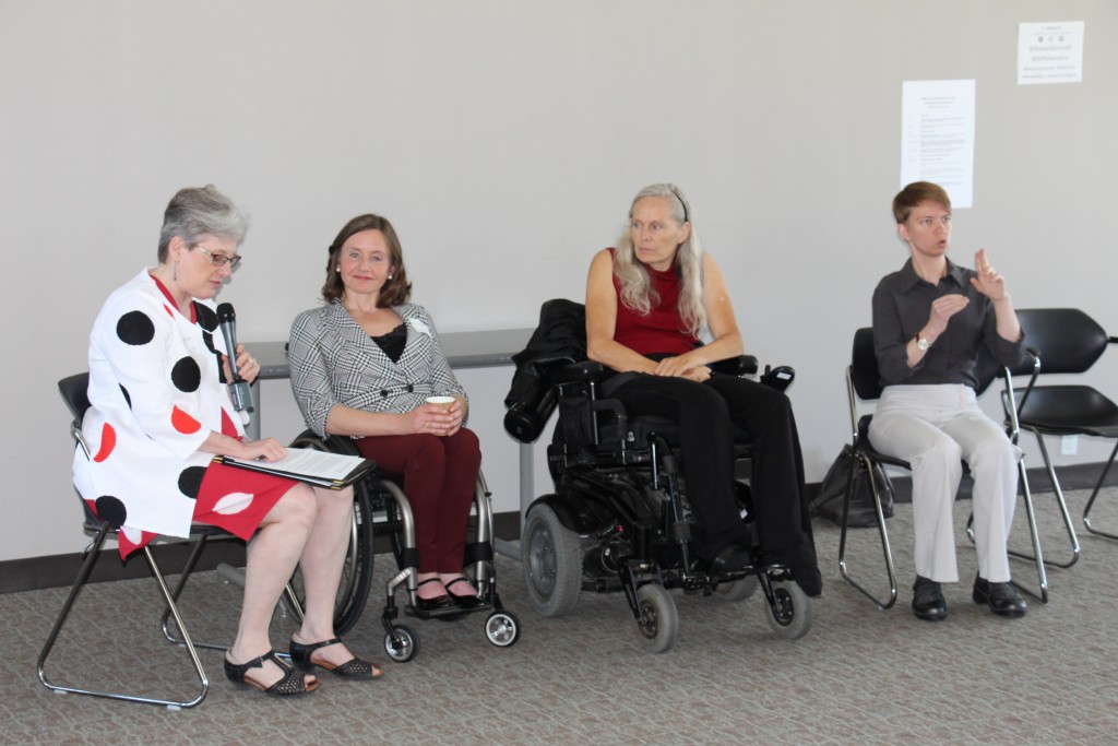 Jeremy Alliger, who produced the first International Festival of Wheelchair Dance in Boston in June 1997, reminisces with Judith Smith, co-founder and artistic director of AXIS Dance Company, while Kristen San Miguel of BDA and Daniela Jacobson of NEFA listen.