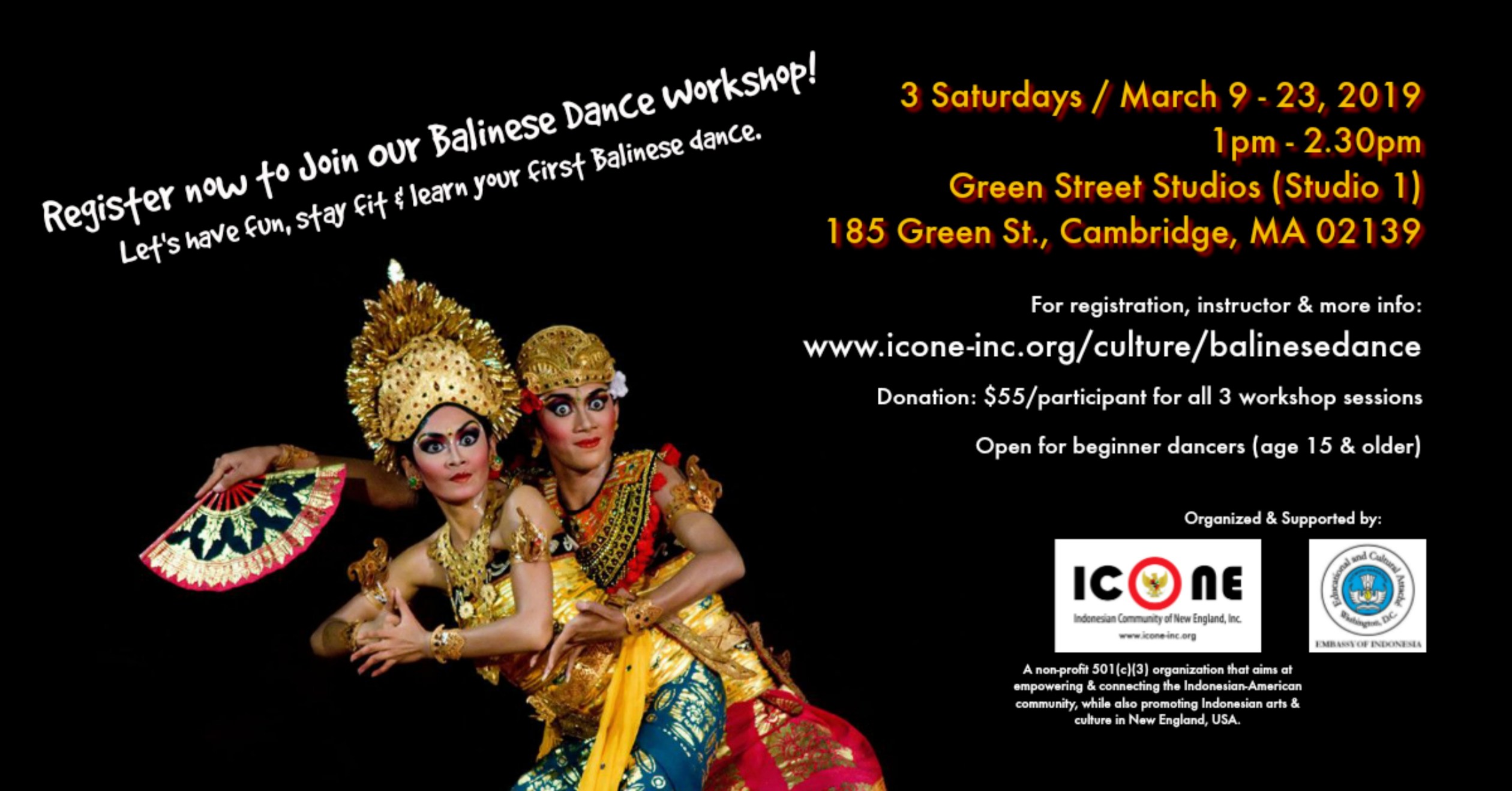 Balinese Dance WHERE Green Street Studios 185 Green Street , Cambridge WHEN The dates for this event have passed COST $55 for series Genre Balinese Who is this class for? Array Suggested Attire We will provide the sash and the sarong for you Whether you have been to Bali or not, you will be mesmerized by the Balinese dance – a very primordial dance tradition that is a part of the religious and artistic expression among the Balinese people. Come and join us at our 3-week sessions of Balinese Dance Workshop this spring to learn the dance basics with our skilled instructor and take pride in your first Balinese dance steps. In this workshop, you will learn one of the most famous Balinese dances called the Puspa Wresti Dance. Designed for beginners, age 15 and older, our instructor will explain the meaning(s) behind the delicate yet striking individual postures and gestures that forms the basics of Balinese dance. You will learn how to dance with the integrated body movements, using your fingers, hands, head, eyes and facial gestures, that make the Balinese dance so unique and beautiful. Such a wonderful way to learn about the richness of Bali-Hindu and Indonesian cultures while enjoying a bit of exercise. Ticket Information