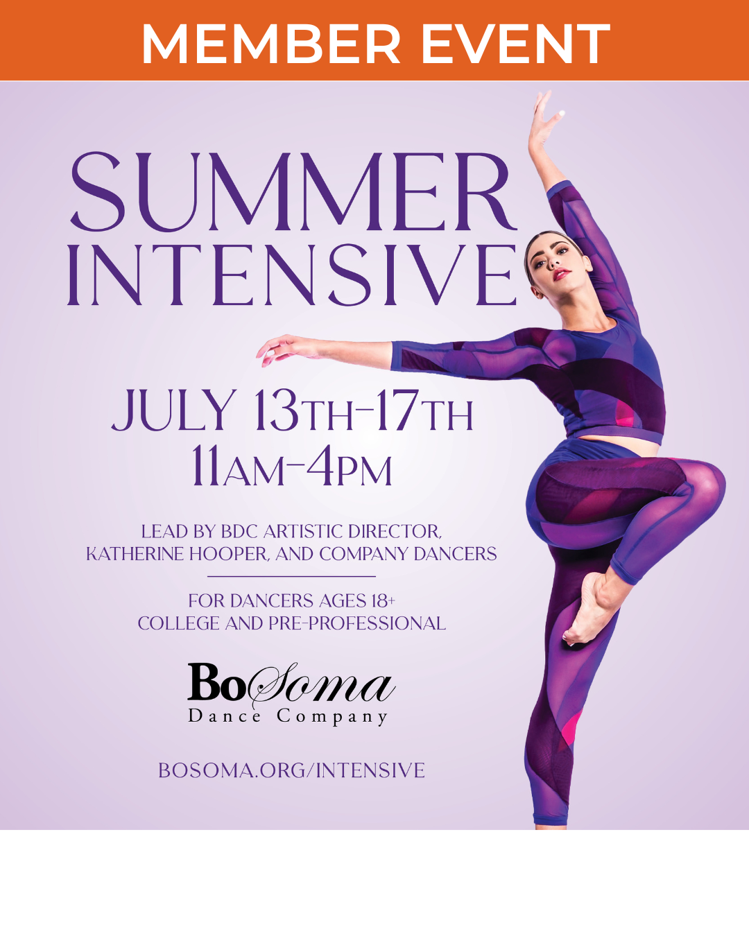 The BoSoma Dance Company Summer Intensive offers dedicated dancers the opportunity to train at a high level in a focused and inspiring environment. Led by Artistic Director Katherine Hooper alongside BoSoma Dance Company members, the intensive emphasizes technical growth, artistic development, and performance quality. Dancers will study Ballet, Modern, Contemporary, and BoSoma repertory with an emphasis on musicality, strength, versatility, and expressive movement. This immersive experience is designed for dancers seeking to deepen their training, challenge themselves, and gain insight into the company’s creative process. Ideal for motivated dancers looking for professional-level instruction in a supportive, collaborative atmosphere.