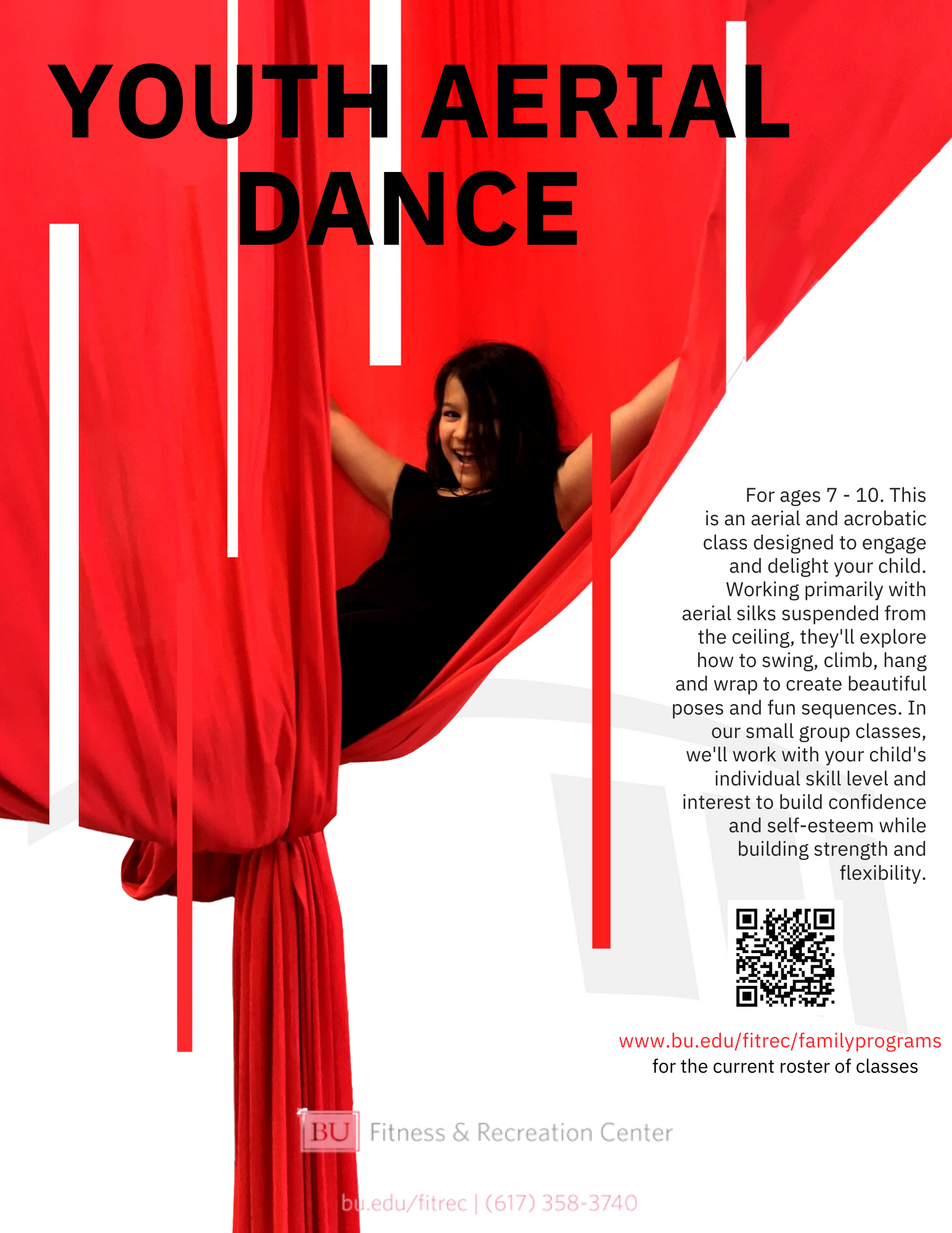 Youth Aerial Dance for ages 7 – 10. This is an aerial and acrobatic class designed to engage and delight your child. Working primarily with aerial silks suspended from the ceiling, they’ll explore how to swing, climb, hang and wrap to create beautiful poses and fun sequences. In our small group classes, we’ll work with your child’s individual skill level and interest to build confidence and self-esteem while building strength and flexibility.