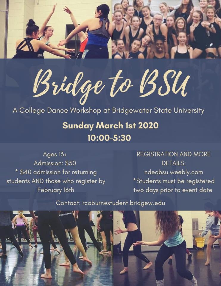 Through this action packed day of dance, students ages 12 and up will take classes in dance composition, creative contemporary, jazz, and musical theater. They will also learn about the dance department at Bridgewater State University and have the opportunity to perform at the end of the day informal showcase.
