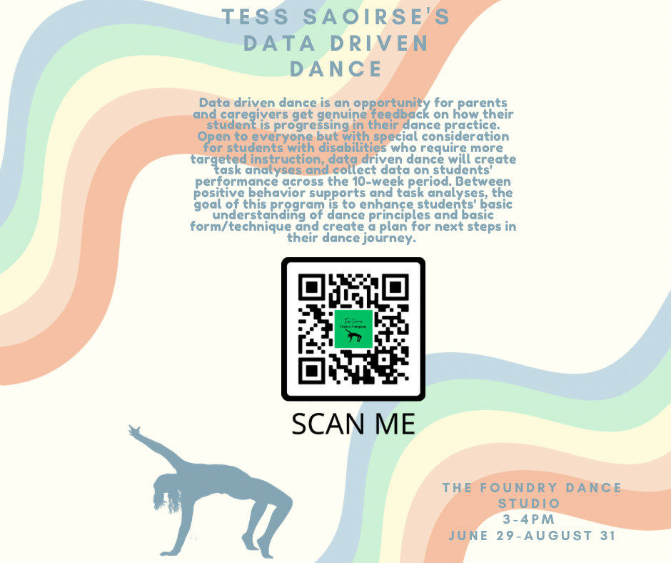 Rainbows on the edges, description of data driven dance, with Logo of dancer in a 1 handed backbend.