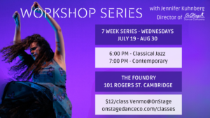 woman with long curly hair, wearing blue dress with billowing skirt, arms in the air, on a purple background