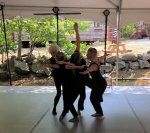 A group of four female dancers dresses in black create a leaning group form with arms outstretched on a grey floored, white canopied pavilion with natural setting in the background.