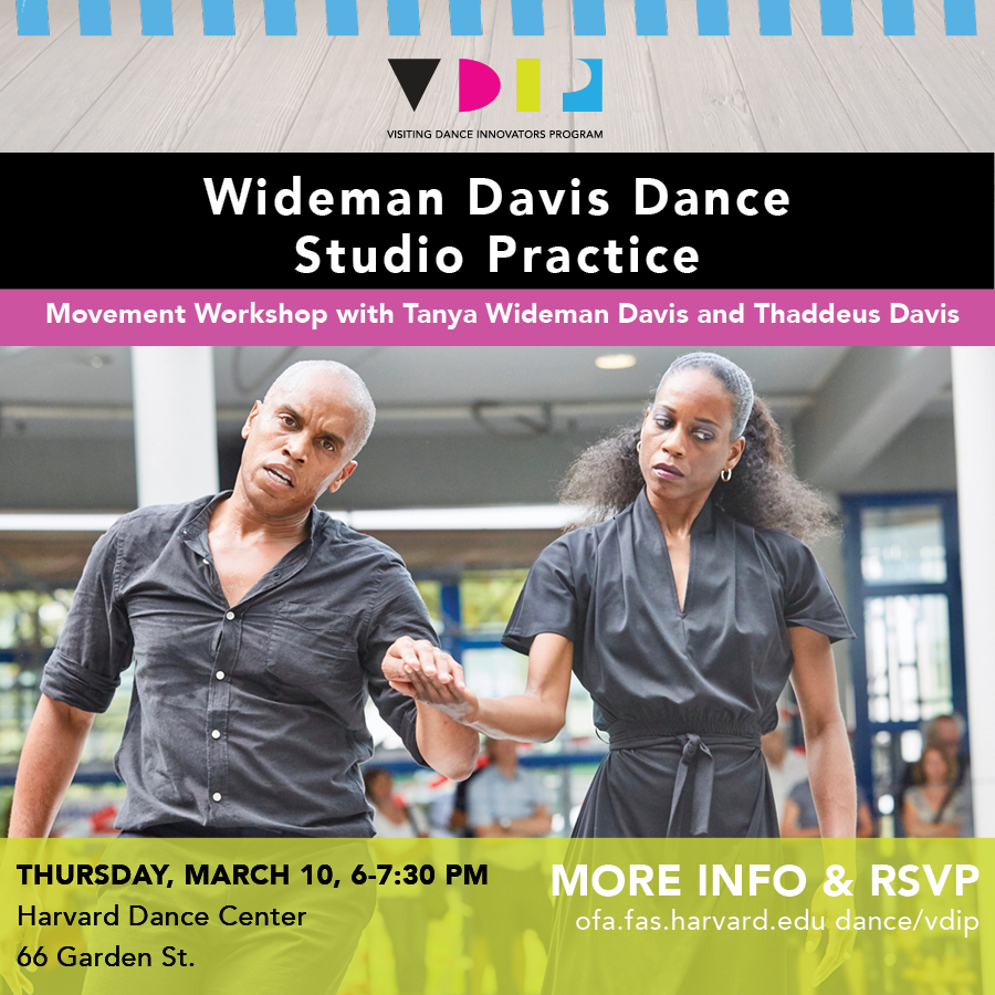 Co-directors Tanya Wideman-Davis and Thaddeus Davis will lead a studio workshop on the company’s process and movement vocabulary. Geared towards intermediate/advanced levels dancers, though adventurous beginners are also welcome.
